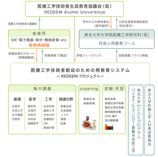 東北大学では、平成14年度には、文部科学省21世紀 COE プログラム「バイオナノテクノロジー基盤未来医工学」プログラムが実施されており、平成15年度からは、今回の計画とは別の科学技術振興調整費によるプロジェクトで、「先進医工学研究機構」という研究組織が作られています。これらの既存のプロジェクトと、今回の REDEEM のプロジェクトは、一部、実際に実施する担当者が重なっており、この3つのプロジェクトで、協力して、終了後に、新しい学部(研究科)「医療工学研究科」を設立して、さらに教育研究を続けていくための準備が始まっています。また、REDEEM プロジェクトそれ自身から、修了する受講者は、それで縁が切れるのではなく、社会に戻っても、それぞれの専門分野を通じて医療工学を発展させることが期待されていますので、OB による、「医療工学技術者生涯教育協議会(仮称)」を結成してもらい実社会での経験などを通じて得られる知識や経験をフィードバックしてもらうことを計画しています。